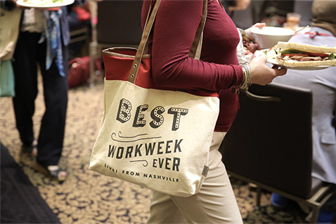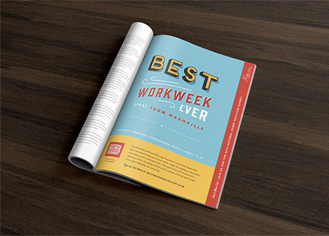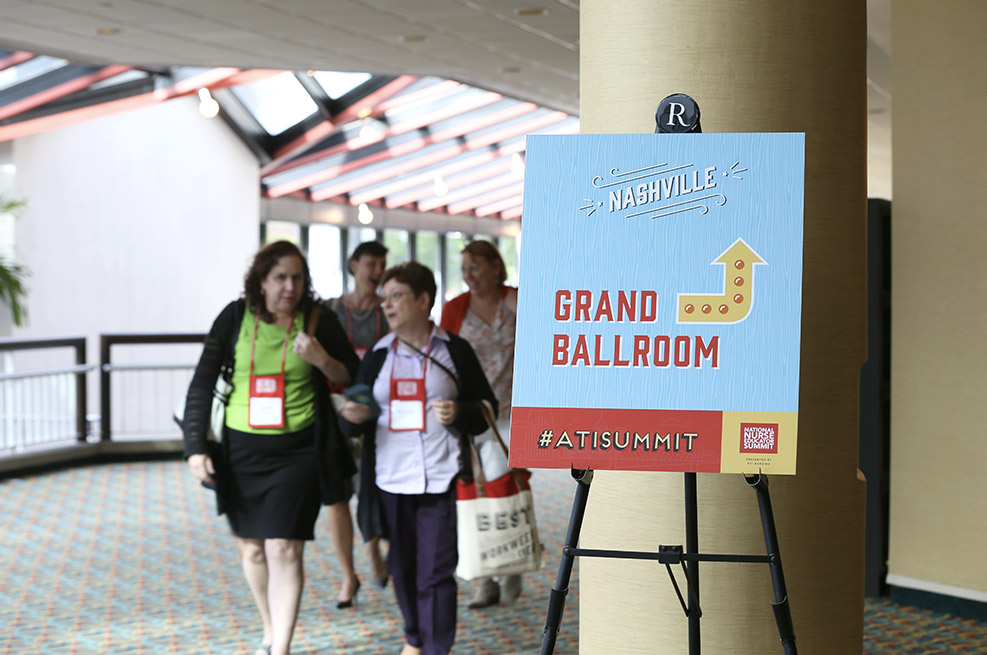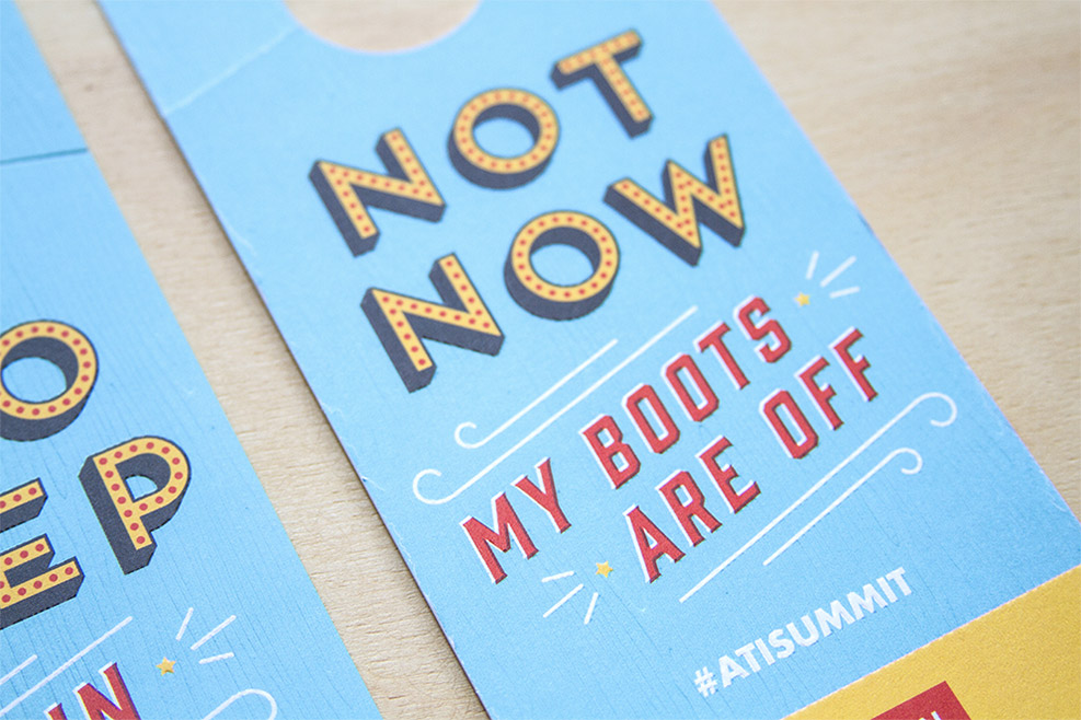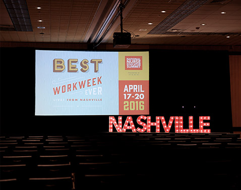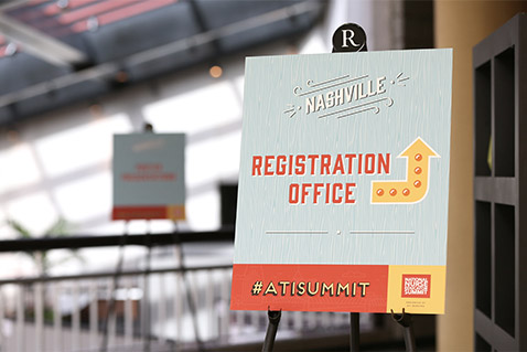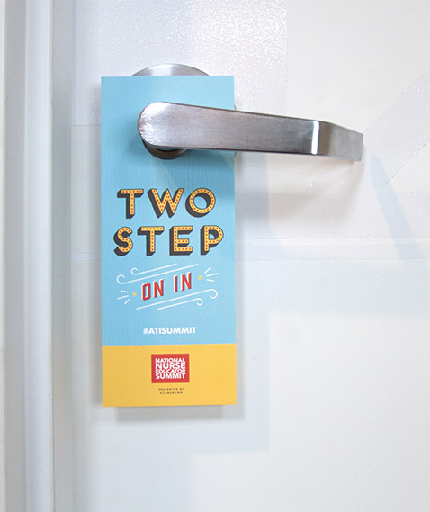 Nurse Educators are a passionate, hard-working group that love the annual ATI Summit. It gives them an opportunity to have a working vacation, because let’s face it — they rarely stop working. The 2016 Nurse Educator Summit was held in Nashville, Tennessee. Taking the picturesque Music City backdrop as inspiration, we named the entire event, “Best Workweek Ever: Live from Nashville.” Embracing this idea, we created everything from wayfinding signs to t-shirts and letterpress door hangers to enhance the overall environment and bring the concept to life.