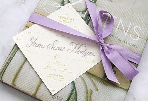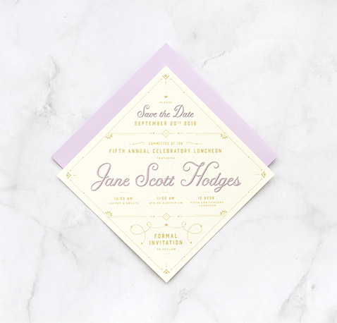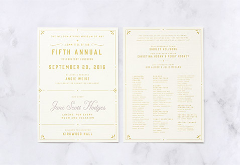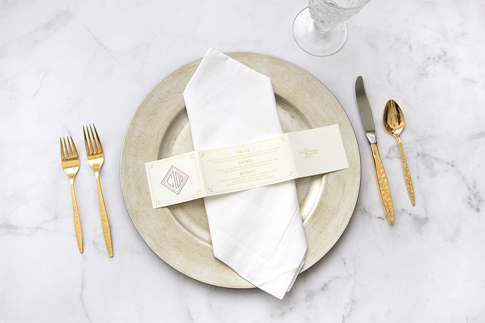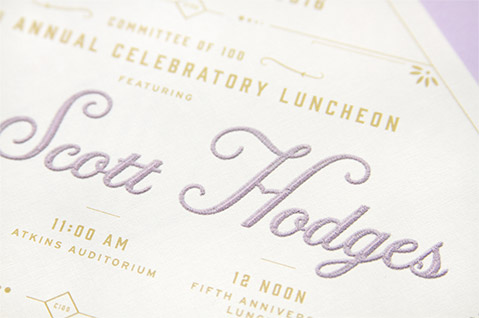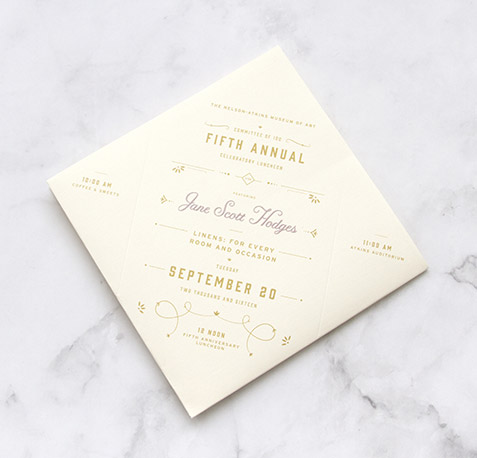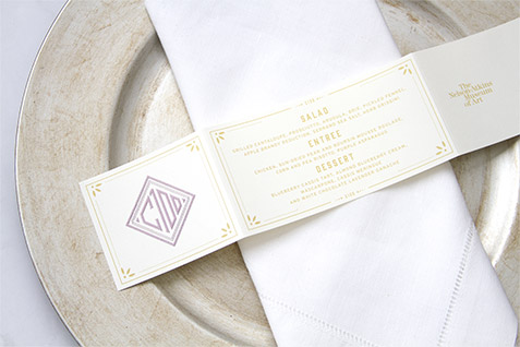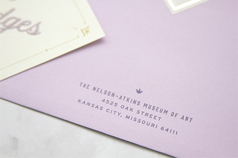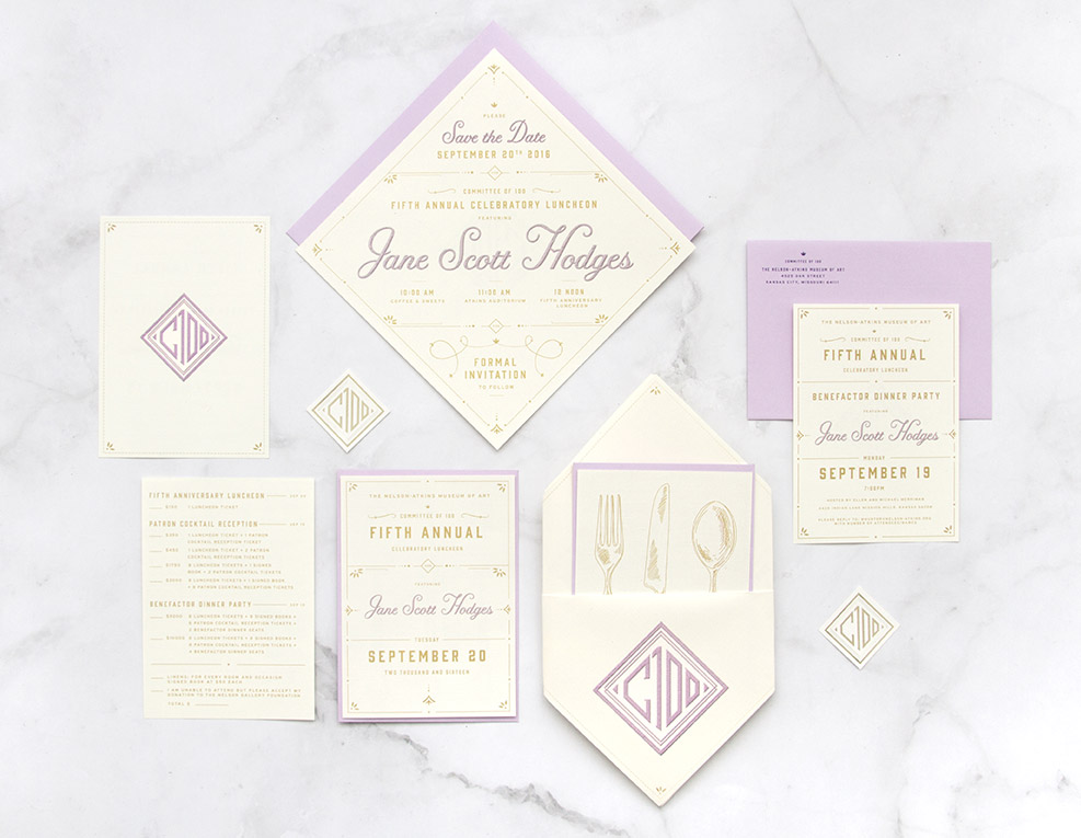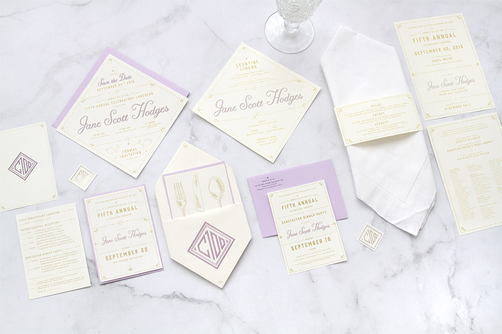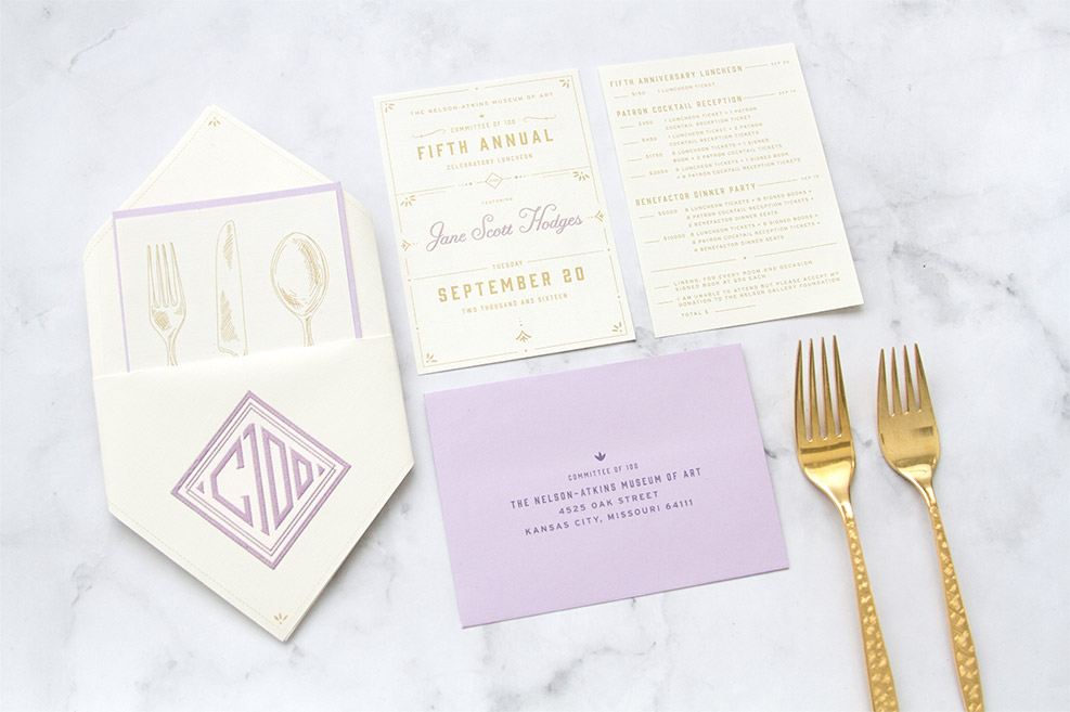 The Committee of 100 annually plans and executes signature fundraising events to benefit The Nelson-Atkins Museum of Art. We were asked to create the invitation suite for its event featuring Jane Scott Hodges. Hodges is the founder and owner of Leontine Linens, a modern design studio that creates personalized fine linens for everyday occasions and entertaining. Infusing Hodges’ favorite lavender hue and her love for traditional embroidery and monogramming, we created an invitation suite that cleverly folded up into an assortment of different napkin types eloquently marked with a custom C100 monogram.